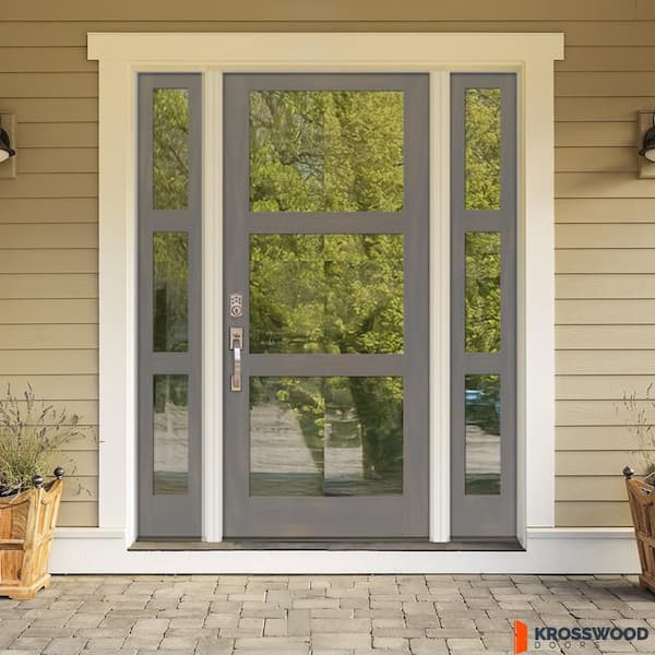 64 in. x 80 in. Modern Hemlock Right-Hand/Inswing 3-Lite Clear Glass Grey Stain Wood Prehung Front Door with Sidelites
