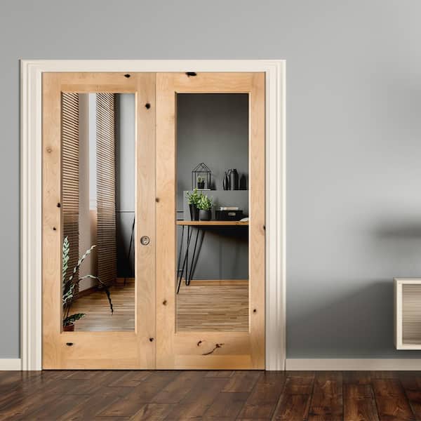 64 in. x 80 in. Rustic Knotty Alder 1-Lite Clear Glass Left Handed Solid Core Wood Double Prehung Interior Door