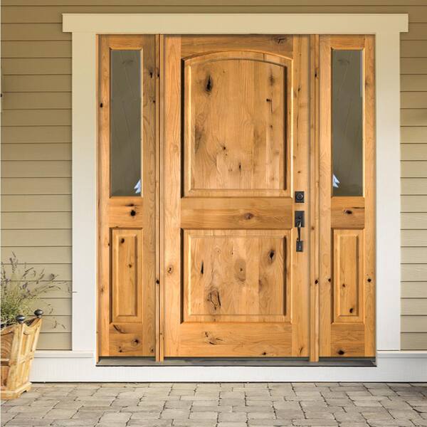 64 in. x 80 in. Rustic Knotty Alder Arch Provincial Stained Wood Left Hand Single Prehung Front Door