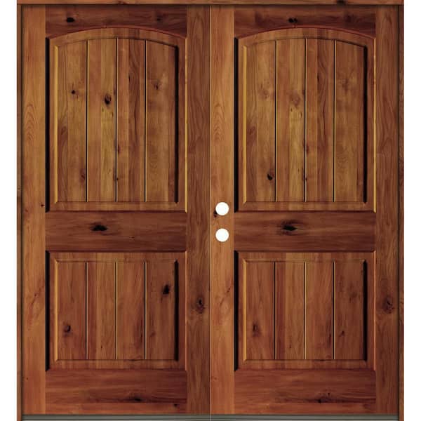 64 in. x 80 in. Rustic Knotty Alder Arch Top Red Chestnut Stain/V-Groove Right-Hand Wood Double Prehung Front Door