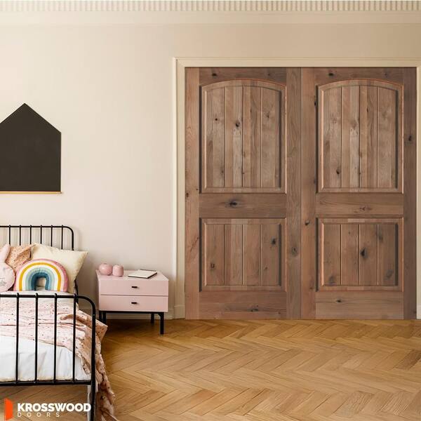 64 in. x 80 in. Rustic Knotty Alder Arch Top VG Both Active True Back Stain Wood Double Prehung Interior French Door