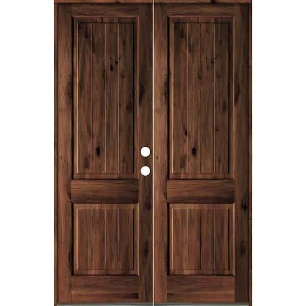 64 in. x 80 in. Rustic Knotty Alder Square Top Red Mahogony Stain/V-Groove Left-Hand Wood Double Prehung Front Door