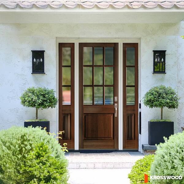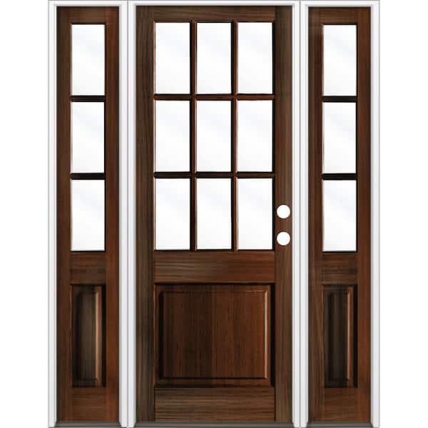 64 in. x 96 in. Farmhouse 9-Lite Clear Glass Left Hand Red Mahogany Stain Hemlock Wood Prehung Front Door w/ DSL