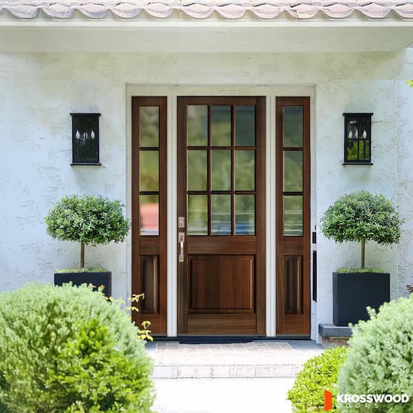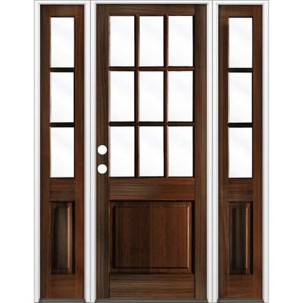 64 in. x 96 in. Farmhouse 9-Lite Clear Glass Right Hand Red Mahogany Stain Hemlock Wood Prehung Front Door w/ DSL