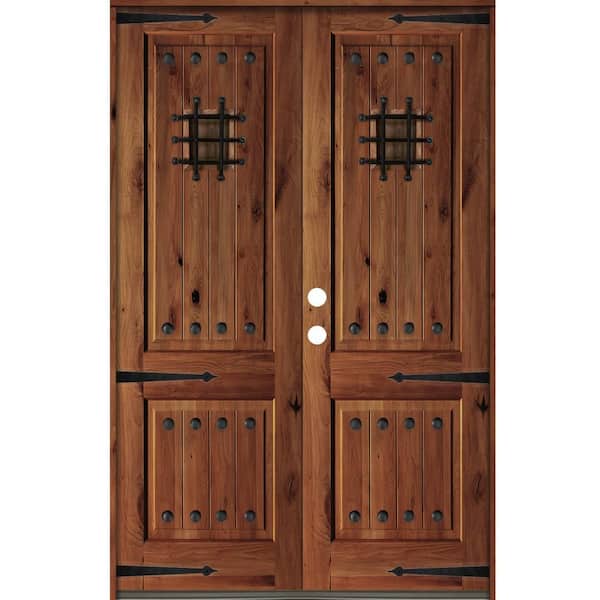 64 in. x 96 in. Mediterranean Knotty Alder Square Top with Red Chestnut Stain Right-Hand Wood Double Prehung Front Door