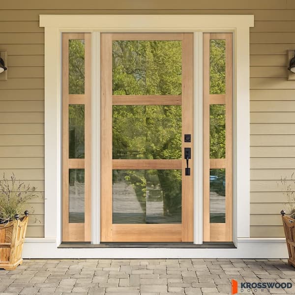64 in. x 96 in. Modern Hemlock Left-Hand/Inswing 3-Lite Clear Glass Clear Stain Wood Prehung Front Door with Sidelites