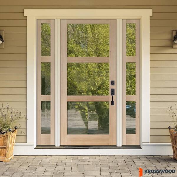 64 in. x 96 in. Modern Hemlock Left-Hand/Inswing 3-Lite Clear Glass Unfinished Wood Prehung Front Door with Sidelites