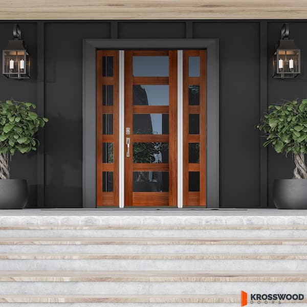 64 in. x 96 in. Modern Hemlock Right-Hand/Inswing 5-Lite Clear Glass Red Chestnut Stain Wood Prehung Front Door w/DSL