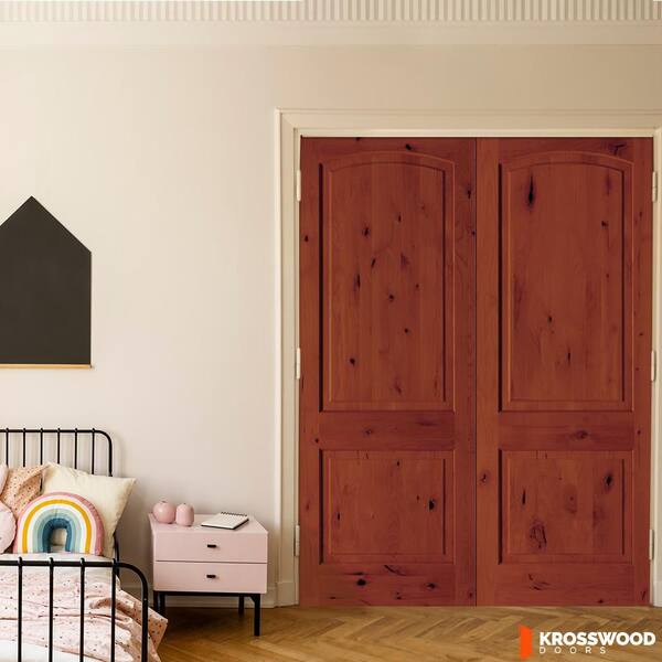 64 in. x 96 in. Rustic 2-Panel Arch Top Universal Amaretto Stain Knotty Alder Wood Double Prehung Interior Door