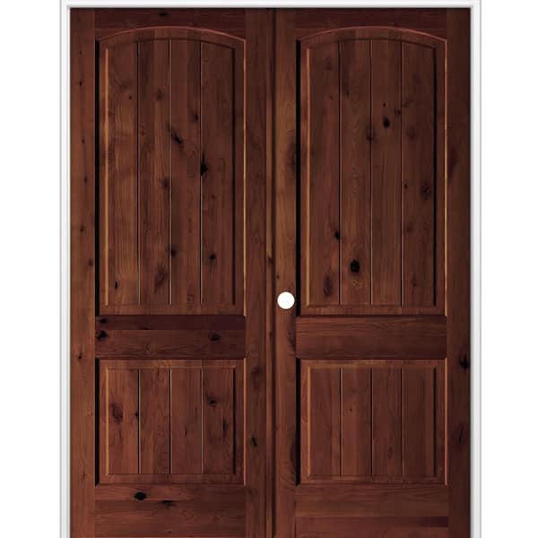 64 in. x 96 in. Rustic Knotty Alder 2Panel Arch Top VG Right Active Red Mahogany Stain Wood Double Prehung Interior Door