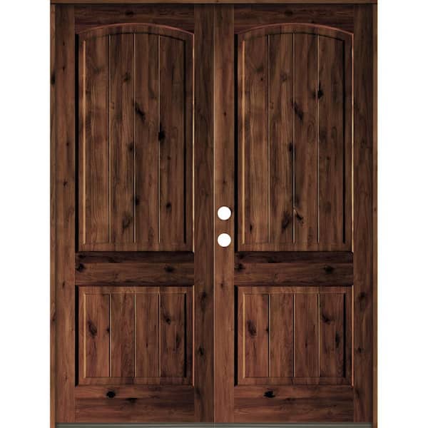 64 in. x 96 in. Rustic Knotty Alder Arch Top Red Mahogony Stain/V-Groove Right-Hand Wood Double Prehung Front Door