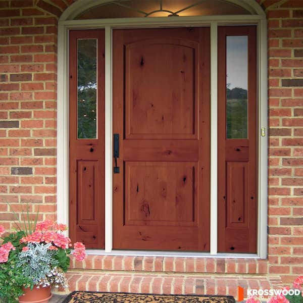 70 in. x 80 in. Knotty Alder 2-Panel Arch-Top Right-H /Inswing Clear Glass Amaretto Stain Wood Prehung Front Door DHSL