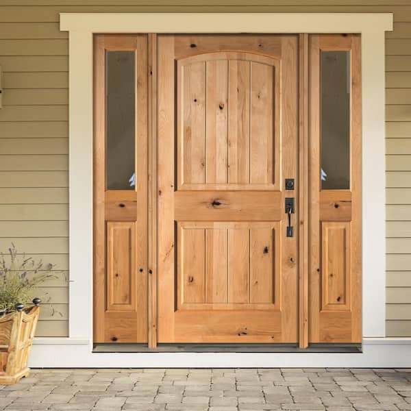 70 in. x 80 in. Rustic Unfinished Knotty Alder Arch Top VG Left-Hand Half Sidelites Clear Glass Prehung Front Door