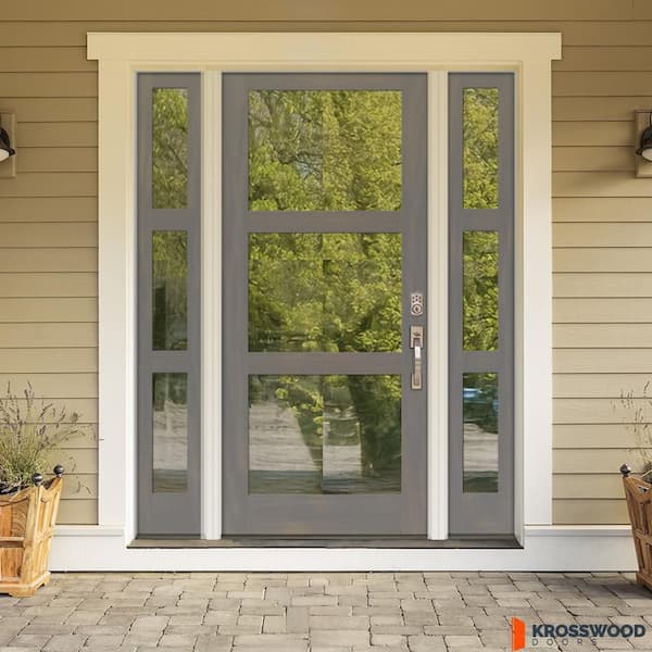 70 in. x 96 in. Modern Hemlock Left-Hand/Inswing 3-Lite Clear Glass Grey Stain Wood Prehung Front Door with Sidelites