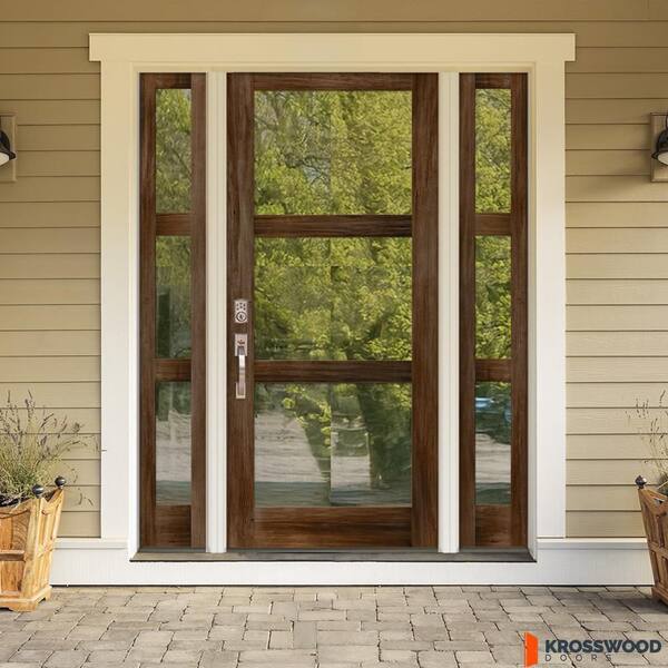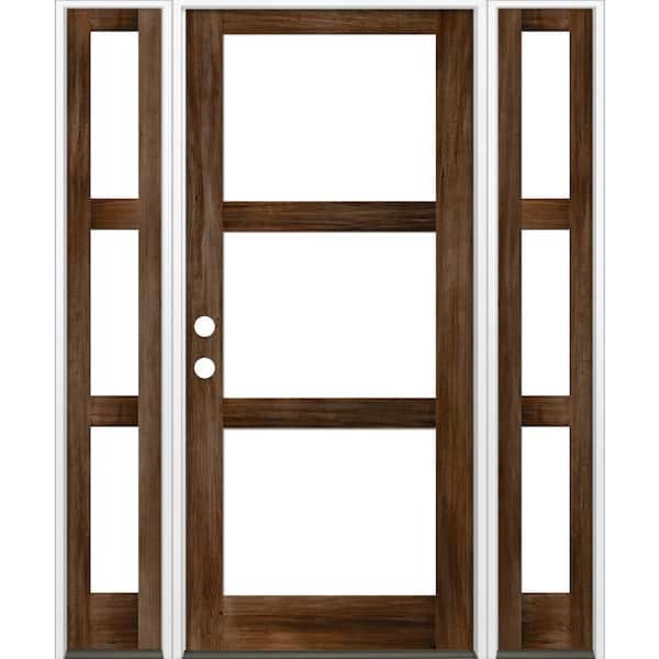 70 in. x 96 in. Modern Hemlock Right-Hand/Inswing 3-Lite Clear Glass Provincial Stain Wood Prehung Front Door with DSL