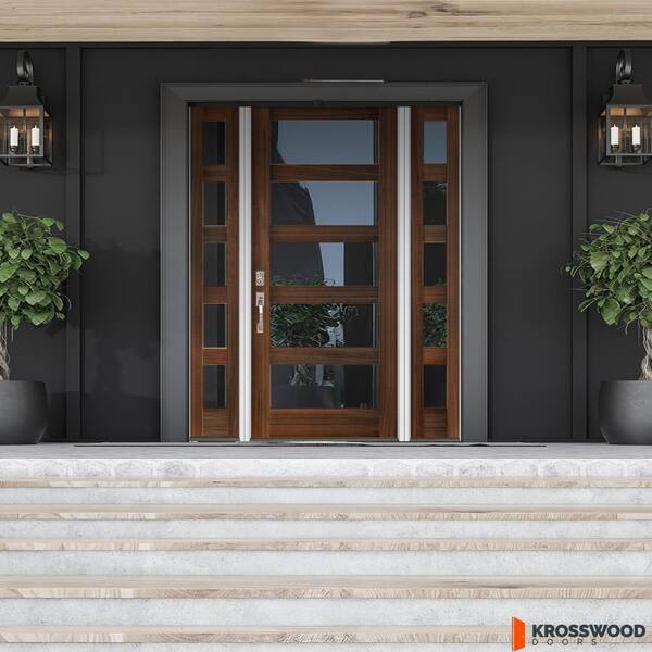 70 in. x 96 in. Modern Hemlock Right-Hand/Inswing 5-Lite Clear Glass Red Mahogany Stain Wood Prehung Front Door w/DSL