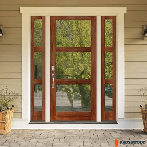 70 in. x 96 in. Modern Hemlock Right-Hand/Inswing Clear Glass Red Chestnut Stain Wood Prehung Front Door with DSL