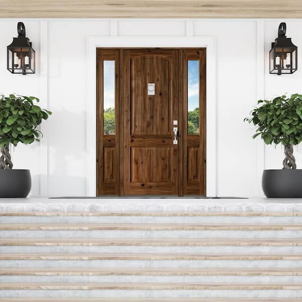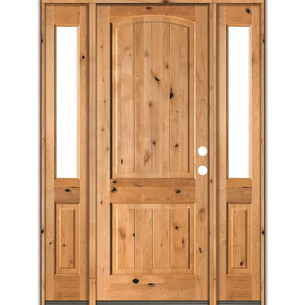 70 in. x 96 in. Rustic Knotty Alder Arch clear stain Wood w.V-Groove Left Hand Single Prehung Front Door/Half Sidelites
