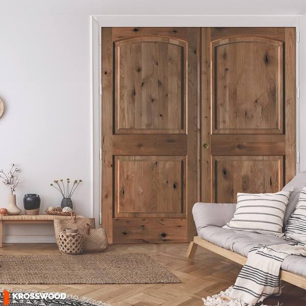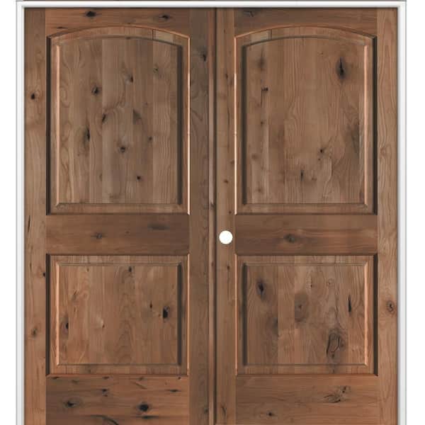 72 in. x 80 in. Rustic 2-Panel Arch Top Right Active True Black Stain Knotty Alder Wood Double Prehung Interior Door