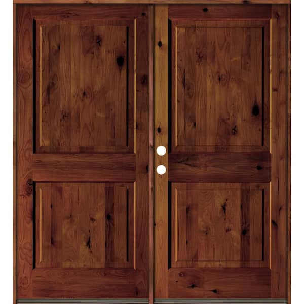 72 in. x 80 in. Rustic Knotty Alder 2-Panel Square Top Red Chestnut Stain Right-Hand Wood Double Prehung Front Door