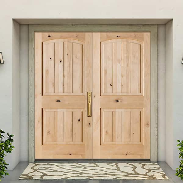 72 in. x 80 in. Rustic Knotty Alder Arch Top Clear Stain /V-Groove Left-Hand Inswing Wood Double Prehung Front Door