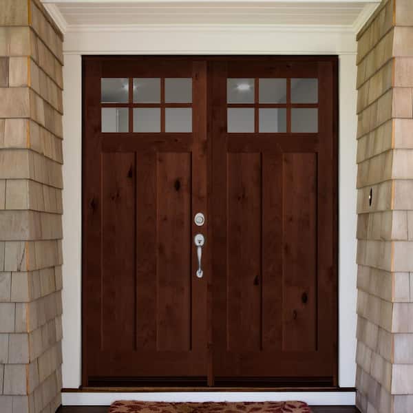72 in. x 96 in. Craftsman Knotty Alder Wood Clear 6-Lite Red Chestnut Stain Left Active Double Prehung Front Door