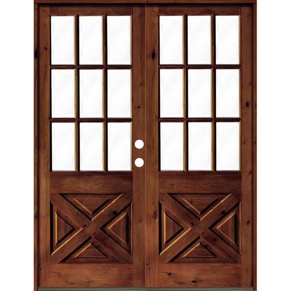 72 in. x 96 in. Knotty Alder 2-Panel Left-Hand/Inswing Clear Glass Red Chestnut Stain Double Wood Prehung Front Door