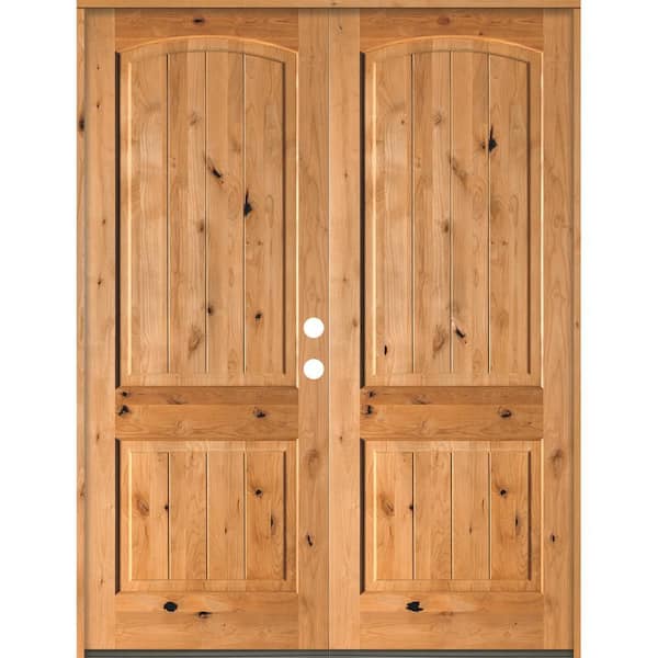 72 in. x 96 in. Rustic Knotty Alder Arch Top Clear Stain /V-Groove Left-Hand Inswing Wood Double Prehung Front Door