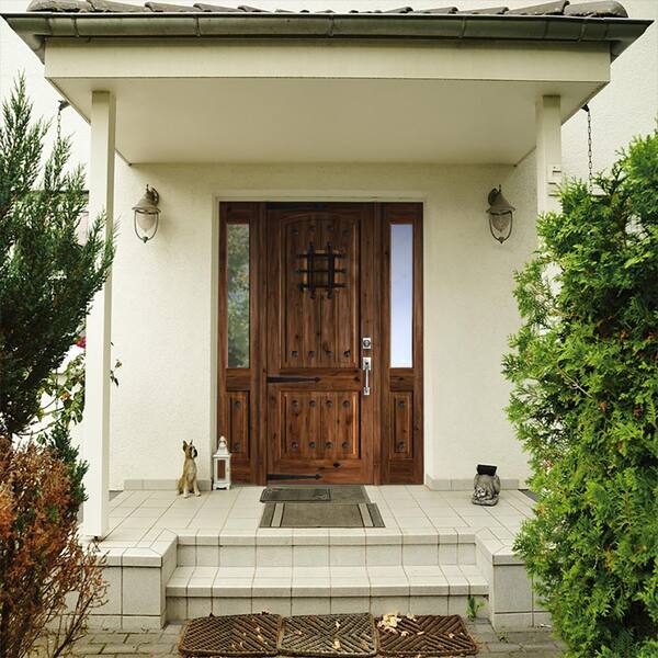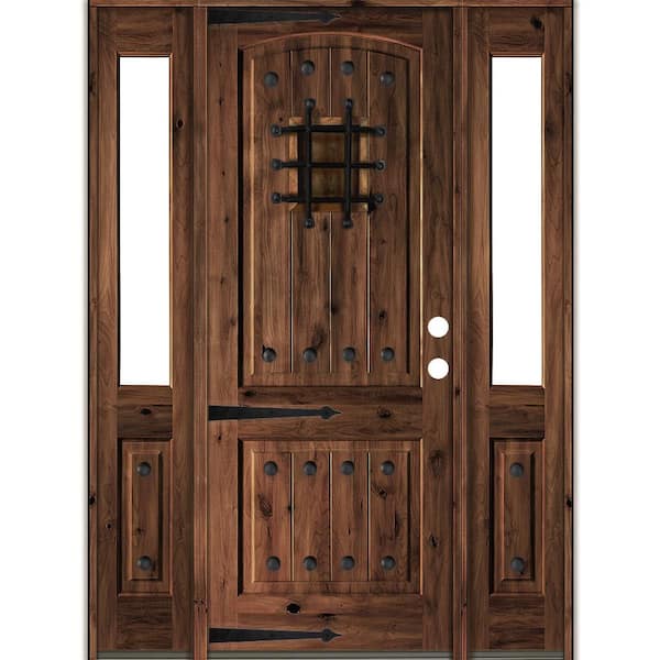 76 in. x 96 in. Medit. Knotty Alder Left-Hand/Inswing Clear Glass Red Mahogany Stain Wood Prehung Front Door w/DHSL