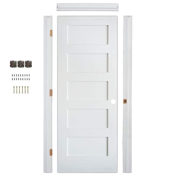 30 in. x 80 in. Shaker 5-Panel Left-Hand Primed Solid Core MDF Wood Single Interior Door Kit w/ Quick Assemble Jamb