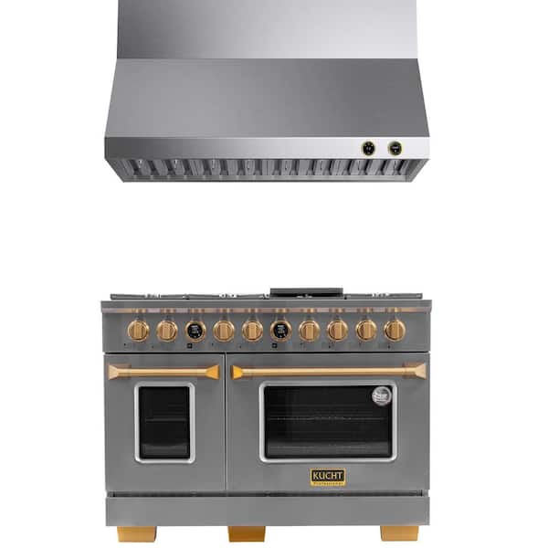48 in. 6.7 cu. ft. 8-Burner Double Oven Dual Fuel Range Propane Gas in Stainless Steel & Gold Plus Wall Mount Range Hood