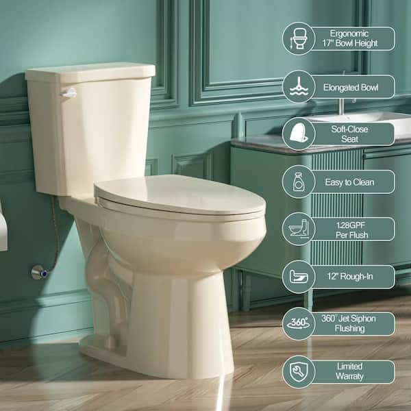 17 in. ADA Height 2-Piece Bone Toilet 1.28 GPF Single Flush Elongated Toilet in 1000g Map with Soft Close Toilet Seat