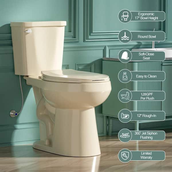 ADA Height Bone Toilet 1.28 GFP Single Flush Round 2-pcs 17 in. Toilet in with Soft Close Seat 12 in. Rough In