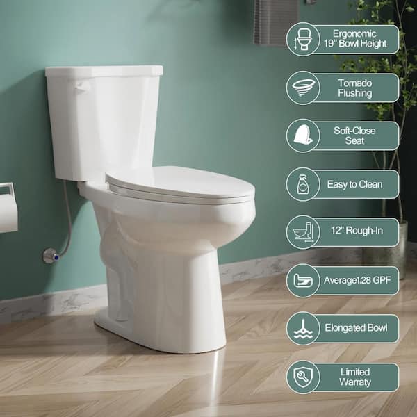 Tall Toilet 1.28 GPF Single Flush Elongated 19 in Bowl Height 2-Piece Toilet in White with Seat Included Comfort Design