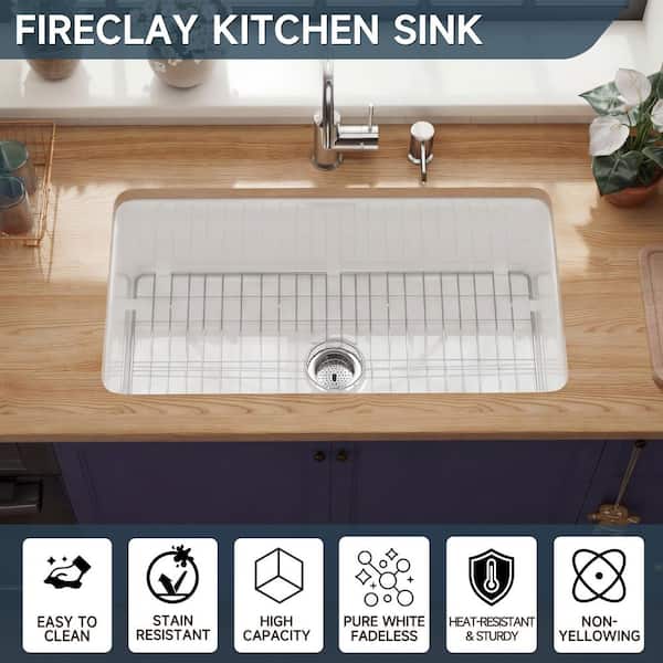 White Fireclay 32 in. Single Bowl Undermount/Drop-In Kitchen Sink with Bottom Grid and Basket Strainer