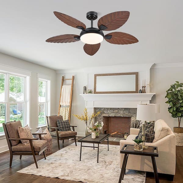 52 in. Indoor/Outdoor Dark Black 5 Palm Leaf Shaped Blades Ceiling Fan with Dimmable LED Light and Remote/APP Control