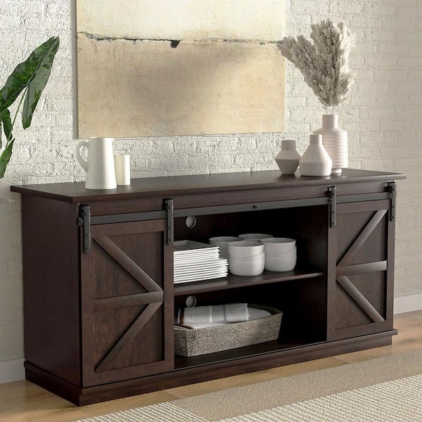 58 in. Espresso Composite TV Stand Living Room Hub Fits TVs up to 65 in. with Sliding Barn Door and Adjustable Cabinets