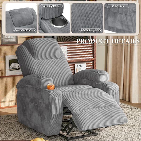 Power Lift Recliner with Massage for Seniors, Classic Single Sofa with 2-Cup Holders, Gray Corduroy