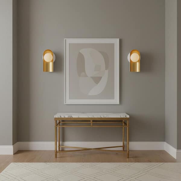 • Modern sconce with a satin off-white and lacquered brass shade