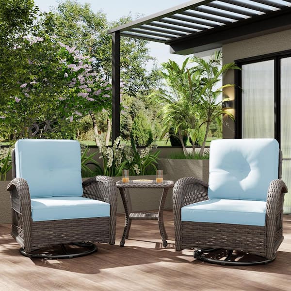 3-Piece Wicker Outdoor Rocking Chair Patio Conversation Set Swivel Chairs Sectional with Baby Blue Cushions