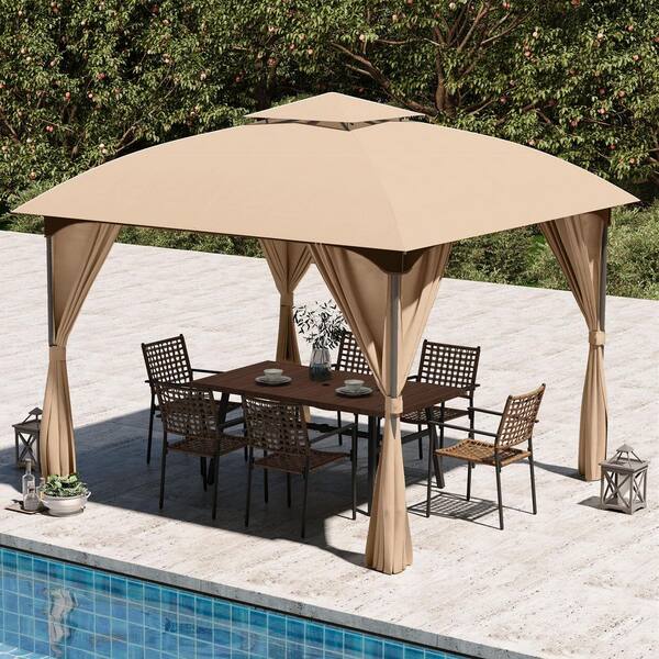 10 ft. x 10 ft. Khaki Outdoor Patio Gazebo with Unique Arc Roof and Privacy Curtains