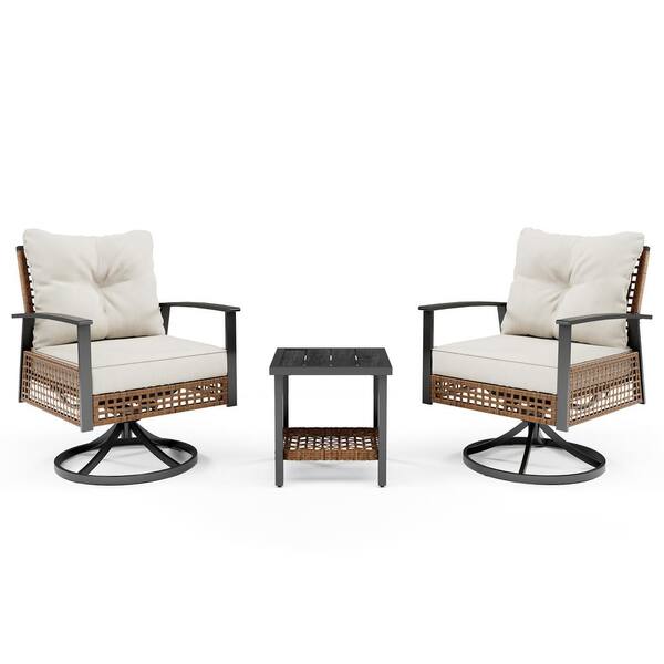 Brown 3-Piece Wicker Patio Conversation Set with Rattan Swivel Rocking Chairs with Beige Cushions and Coffee Table