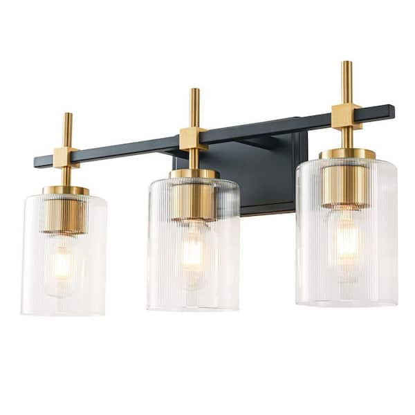 21 in. 3 Light Matt Black Paint/Gold Plating Vanity Light with Clear Ribbed Galss Shade