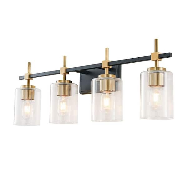 29.3 in. 4 Light Matte Black Paint/Gold Plating Vanity Light with Clear Ribbed Galss Shade