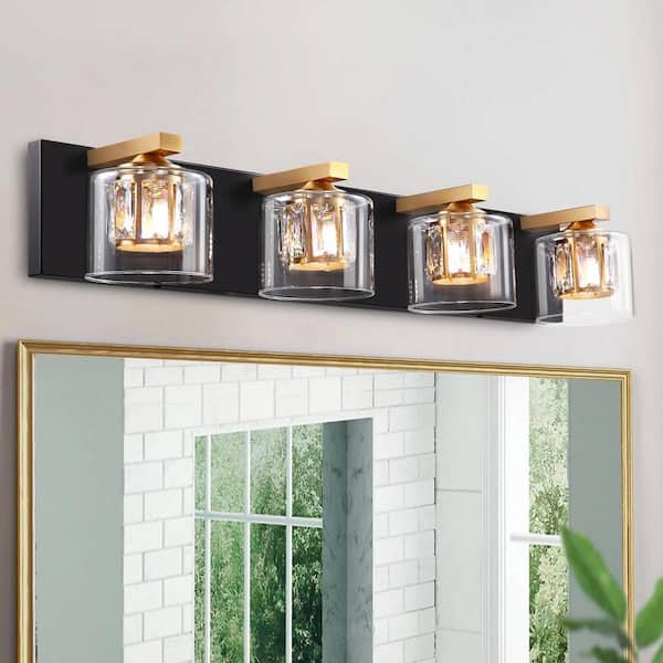 Delvon 29 in. W 4-Light Matte Black/Gold Vanity Light with Double Layer Clear Glass and Crystal Shades for bathroom