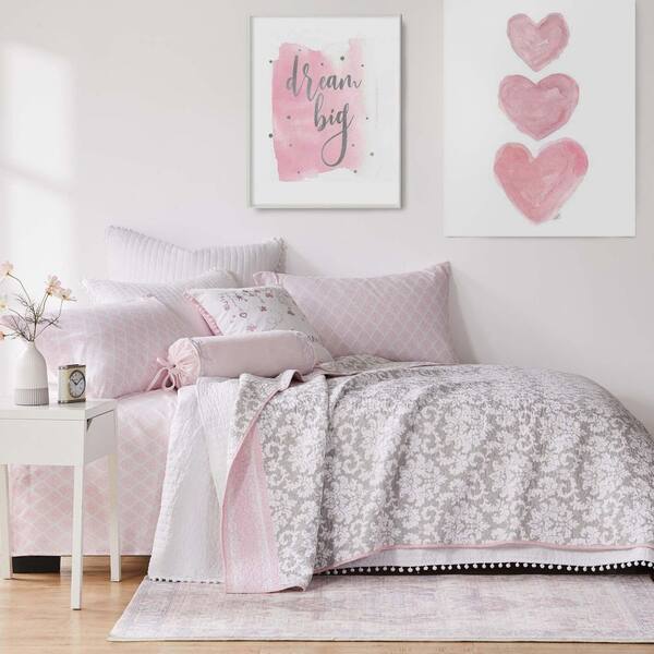 Margaux 3-Piece Grey and Pink Damask Cotton Full/Queen Quilt Set