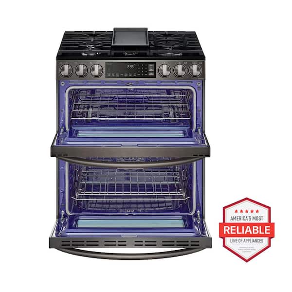 30 in. W 6.9 cu. ft. Smart Slide-In Double Oven Gas Range with ProBake and InstaView in Printproof Black Stainless Steel