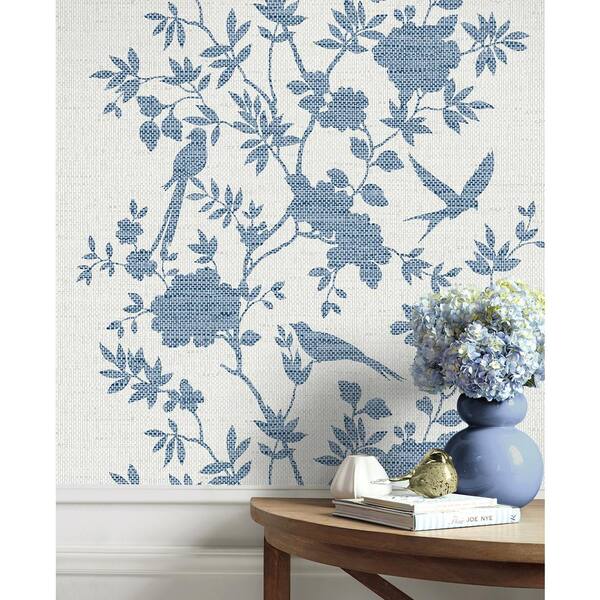 60.75 sq. ft. Coastal Haven Denim Blue Aloha Bird Trail Embossed Vinyl Unpasted Wallpaper Roll