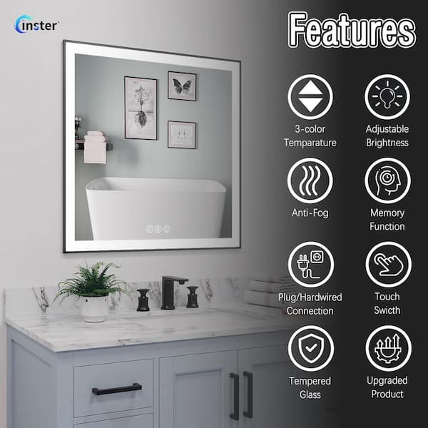 LINE 36 in. W x 36 in. H Square Black Framed Wall Mount Anti-Fog Bathroom Vanity Mirror with LED Light and Memory