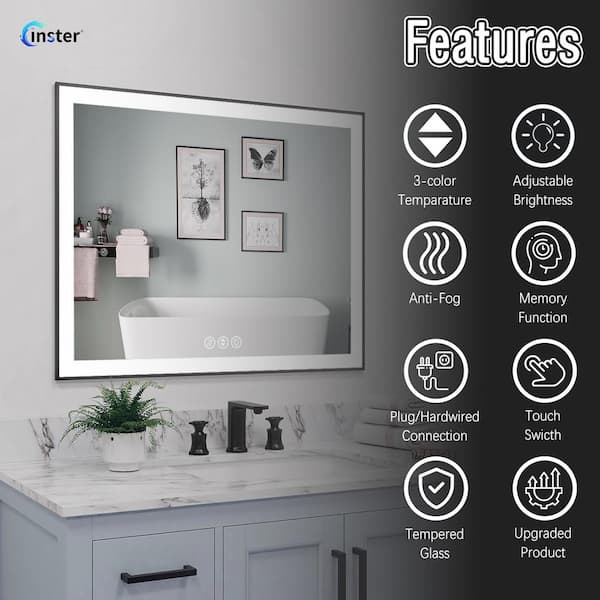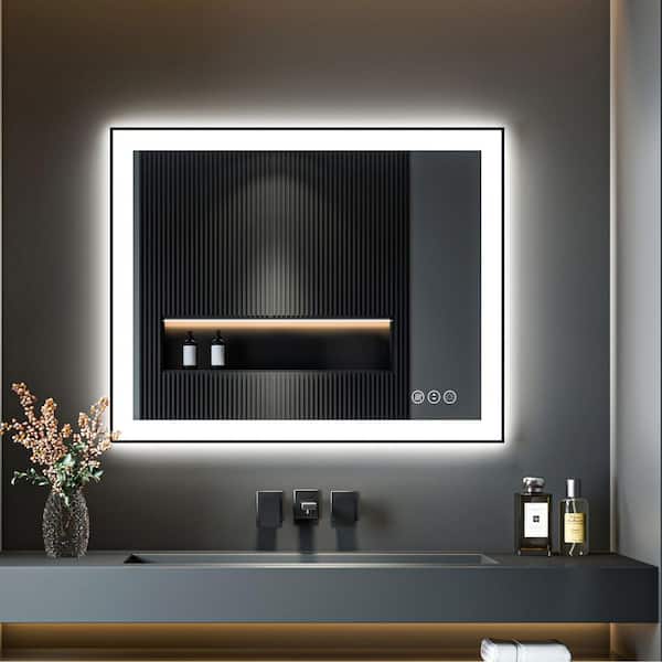 LINE 40 in. W x 32 in. H Rectangular Black Framed Wall Mount Anti-Fog Bathroom Vanity Mirror with LED Light and Memory